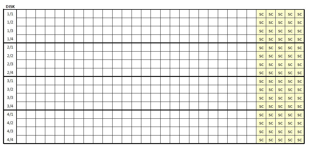 From here on I will use this graphic that gives you a view of a 4 chassis array, each with 1 magazine of 4 disks and I have drawn 30 chunklets per disk.