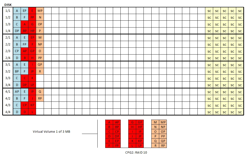 2) Spare chunklets: as you might have noticed I allready coloured some chunklets at the rear. These are the ‘Spare Chunklets’ (in de pictures you’ll see them under ‘SC’). By default the 3PAR array devides its space into regular and spare chunklets. These last ones will be used for example when a drive/magazine/chassis fails, it are also these chunklets that will be used for dynamic optimization, …