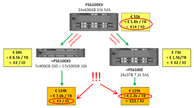 So I always started wth a generic model that only covered the next 12 months. But due to it’s sublun tiering I could scale for same price towards performance or towards capacity. But guess what: I would never have been able to scale this to a petabyte. I would never have scaled this for 30 hypervisors. But hey: I would never need to go there! And even more; over 90% of my customers would never have outgrown an Equallogic cluster. And if they did, maybe a second cluster would have helped them and that wouldn’t really have been a big problem when you hit that level.
