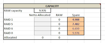 RAW Capacity = { #disks * disk Size * 93,13% (formatted size) } – 2 * Protecion Level